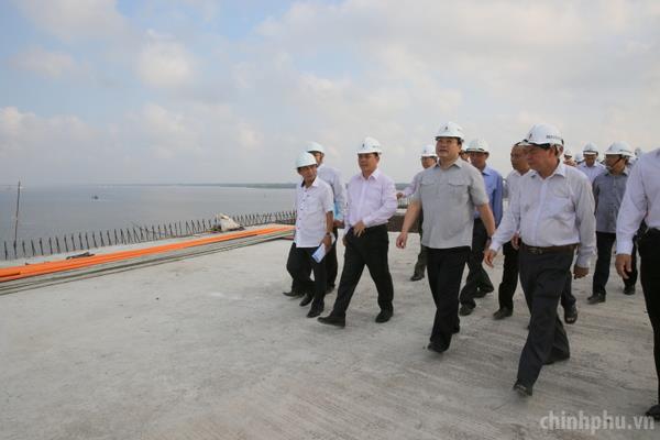 Sáng 7/3, Phó Thủ tướng Hoàng Trung Hải đã thị sát công trường xây dựng cầu Cổ Chiên. Ảnh: VGP/Nguyên Linh